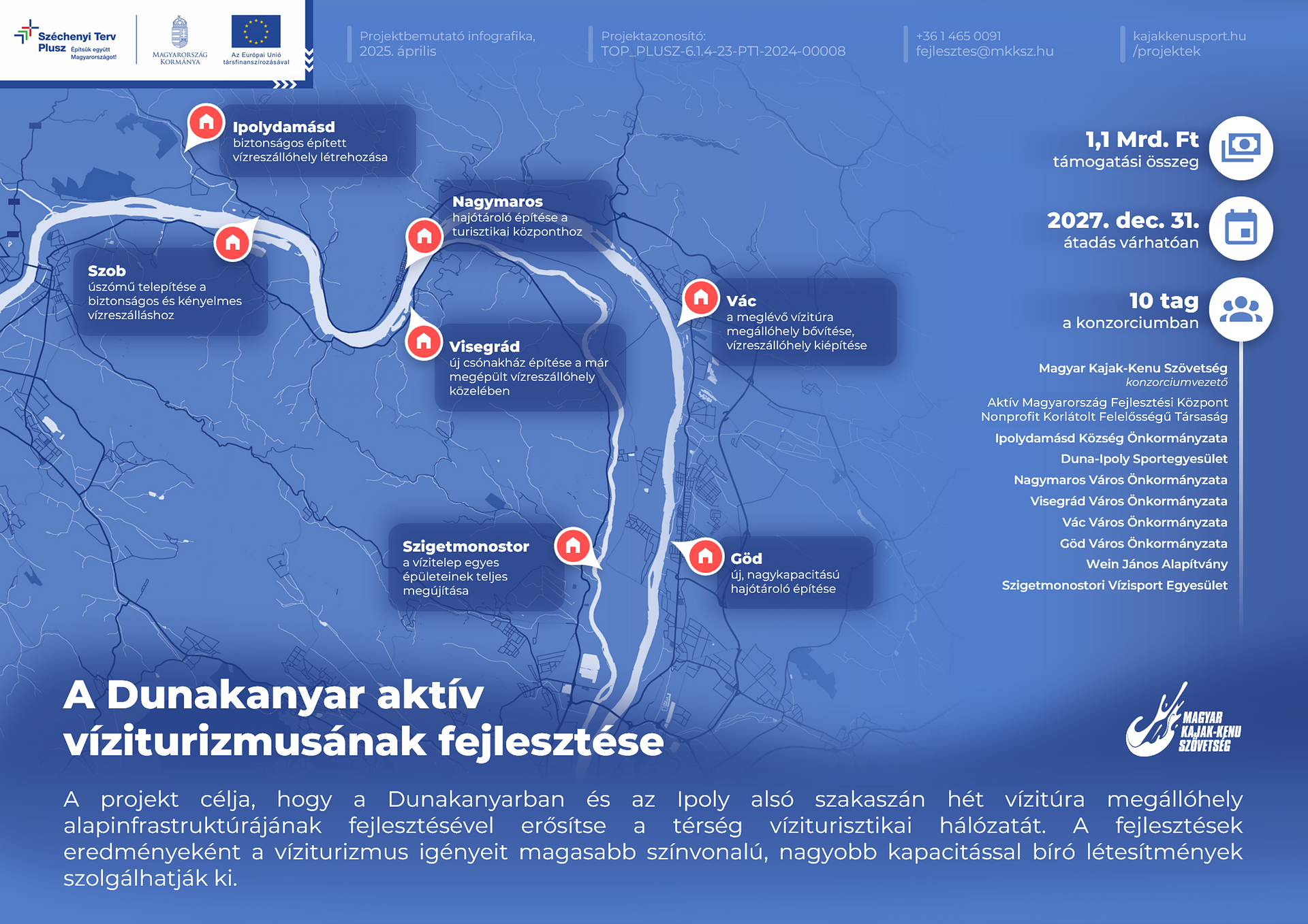 A Dunakanyar aktív víziturizmusának fejlesztése című projektet egy tíztagú konzorcium valósítja meg, melynek konzorciumvezetője a Magyar Kajak-Kenu Szövetség, tagja az Aktív Magyarország Fejlesztési Központ Nonprofit Kft., Ipolydamásd Község Önkormányzata, Duna-Ipoly Sportegyesület, Nagymaros Város Önkormányzata, Visegrád Város Önkormányzata, Vác Város Önkormányzata, Göd Város Önkormányzata, Wein János Alapítvány, Szigetmonostori Vízisport Egyesület.